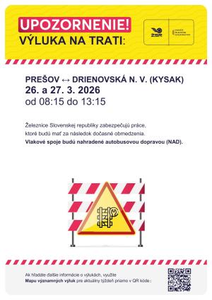 Výluka na trati /Prešov/ Drienovská Nová Ves- Kysak 04.-05.09.2025 od 08:10 - 13:45 hod.