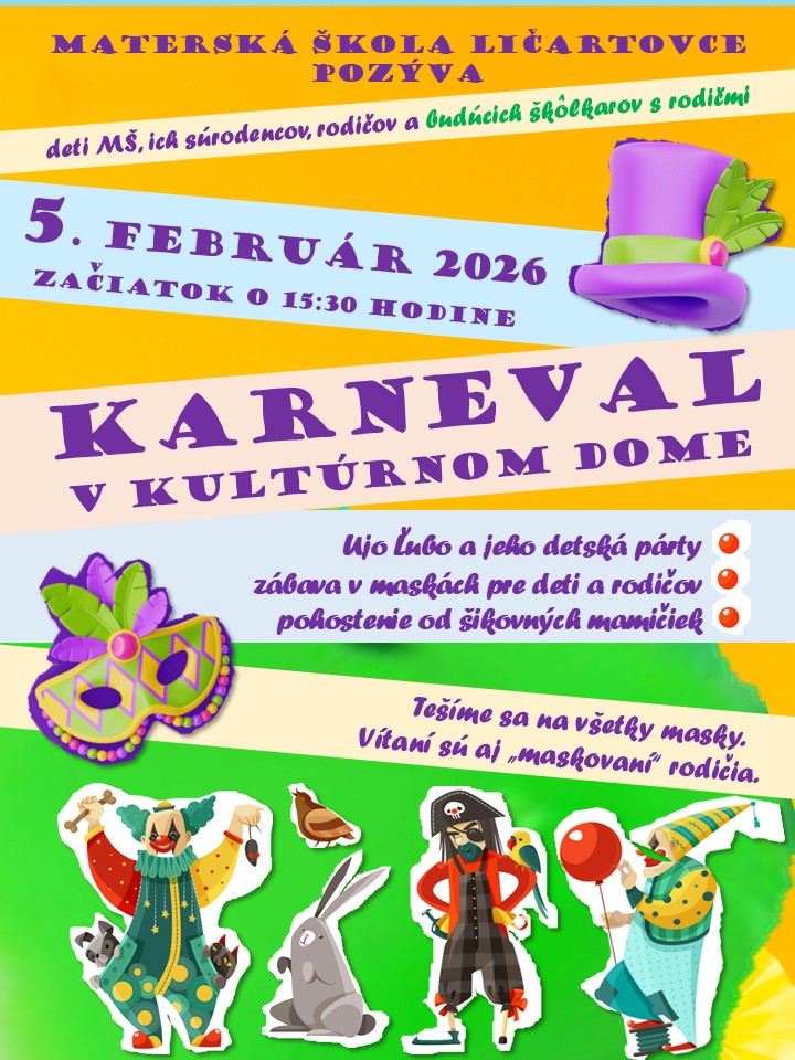 Pozývame Vás na karneval MŠ Ličartovce, ktorý sa bude konať dňa 5.2.2026 o 15.30 hod. v Kultúrnom dome Ličartovce.